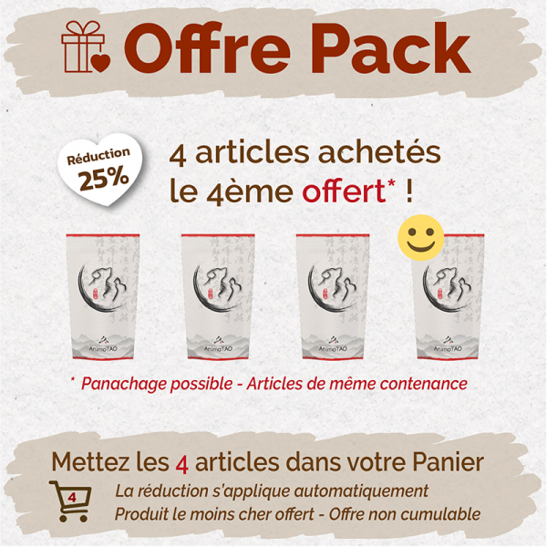 Dans ce cas, nous vous conseillons de choisir la gamme Cani-TAO en adaptant le dosage proportionnellement au poids de l'animal, à raison d'une gélule ou 2 comprimés pour 3 kg de poids, ou une demi dosette pour 5 kg de poids.